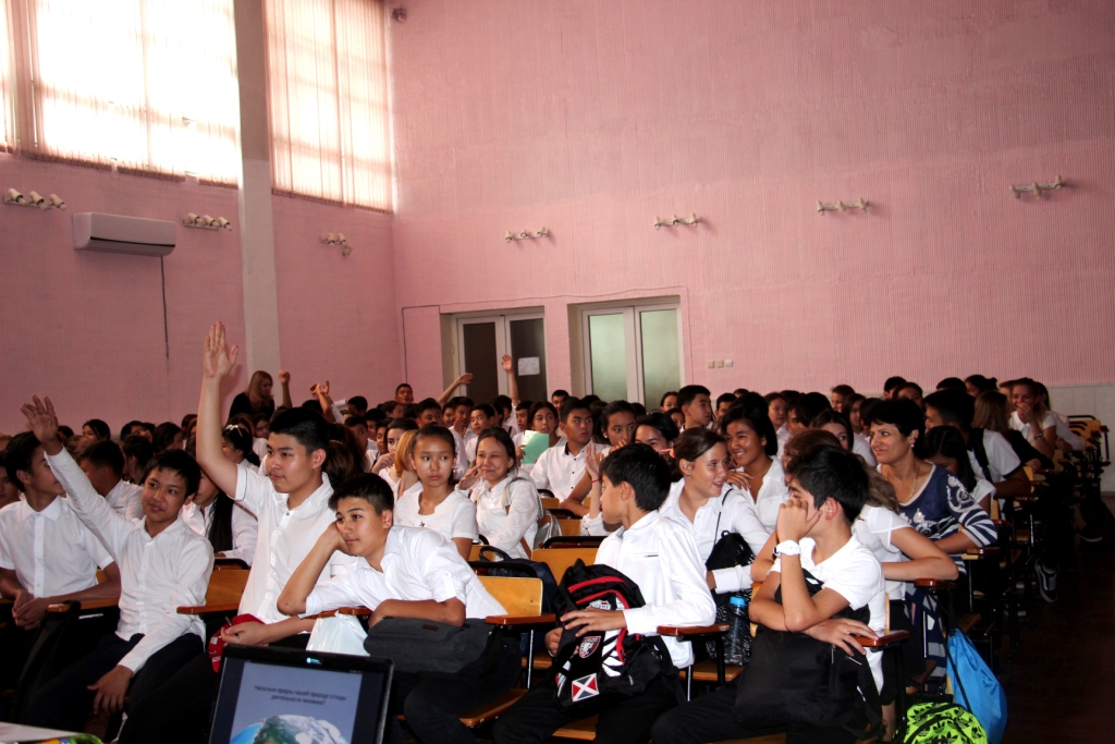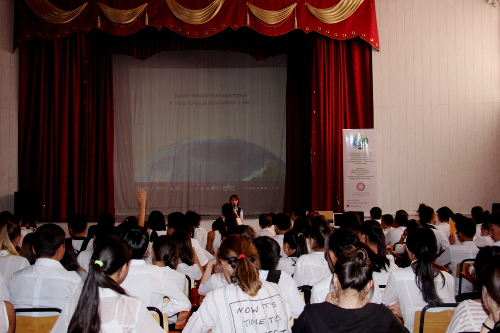 Also, the children were talked about the upcoming eco-month (September 20 – October 20) in the framework of which the capital schools will organized extracurricular lessons on ecology, take part at the competition for waste paper collection, solid waste and batteries and various other activities. Curious students listened with great interest and asked many kinds of questions, including: Why there is no centers for collection of used batteries in Kyrgyzstan? What is the difference between bio bag and plastic bag, etc.?