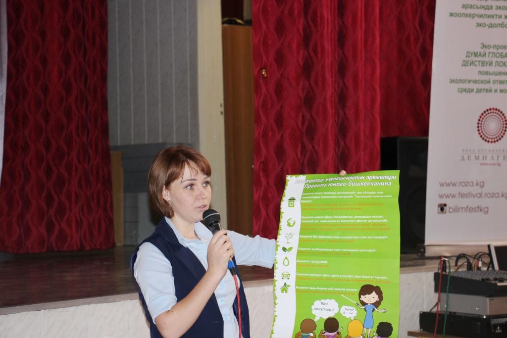 Representatives of the eco - project "Think globally, Act locally: raising environmental responsibility among children and youth" and Public Eco Fund "Yrystan" demonstrated to the children an interactive presentation on various environmental issues, showed social eco videos taken in conjunction with various partners, calling for respect for the environment, as well as the video film on the fourth Festival of Education: Environment and Health, held on April 22-23, 2016 in Bishkek city.