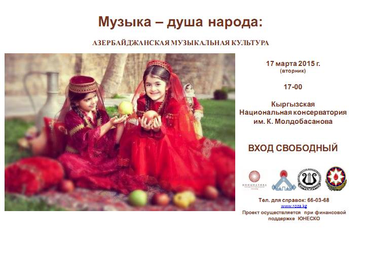Силерди, Силердин досторуңарды жана жакындарыңарды 17-мартта (шейшемби) азербайжан музыкалык маданиятынын концертине чакырабыз.