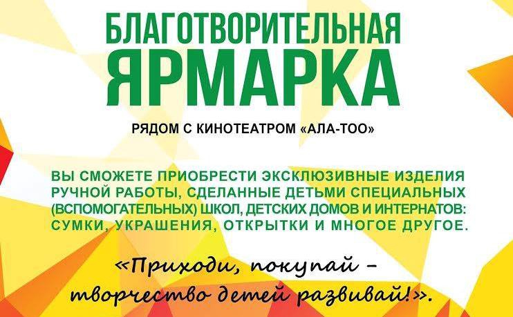 IV Билим берүү фестивалынын алкагында «Кел, сатып ал – балдардын чыгармачылыгын өнүктүр!» кайрымдуулук ярмаркасы өтөт. Кайрымдуулук ярмаркасынын катышуучуларынан атайын (көмөкчү) мектептердин, жатак мектептердин, балдар үйлөрүнүн жана реабилитациялоо борборлорунун тарбиялануучуларынын колу менен жасалган кайталангыс буюмдарды сатып алуу менен, силер асыл ишке өз салымыңарды кошосуңар.