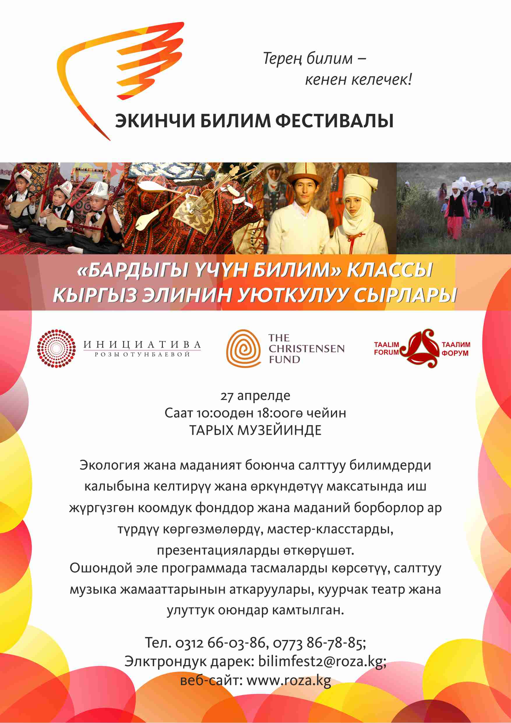 Экинчи Билим фестивалы техникалык кесиптерге кызыгууну кайрадан жаратууга, ошондой эле балдардын илимий-техникалык чыгармачылыгын өнүктүрүүгө жана салтка айланган экологиялык билимдерди жайылтууга багытталган.