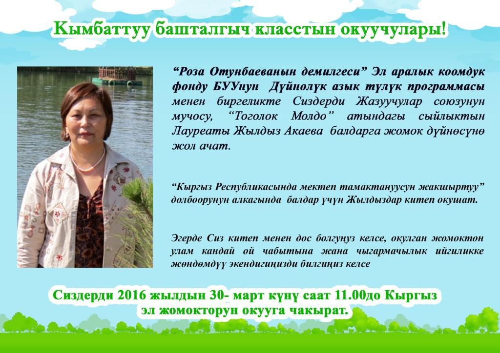 Эгерде китеп менен дос болгунуз келсе, окулган жомоктон улам, кандай ой чабытына жана чыгармачылык ийгиликке жөндөмдүү экендигинизди билгиниз келсе, Сиздерди 2016 жылдын 30 март күнү саат 11.00 дө Нарын областынын, Кочкор районунун, Кызыл Дөбө орто мектебинде, 31 март күнү Жергетал АӨ, А. Табалдиев орто мектебинин окуу залында Кыргыз эл жомокторун окууга чакырабыз.