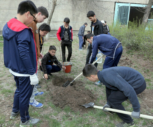 Мектептердин жанындагы аймактарды жашылдандыруу боюнча акцияга жогорку жана кенже класстардын окуучулары катышты. Жогорку класстардын окуучулары көчөттөрдү отургузушунун идеясы мында турат: алар жыл бою бактарды карайт жана окуу жылынын аягында бул көчөттөрдү кенже класстардын окуучуларынын камкордугуна жана кайтаруусуна өткөрүп берет, бул болсо балдарда курчап турган чөйрө жана өз шаарынын тазалыгы үчүн жоопкерчилик жана катышуу сезимин пайда кылат.