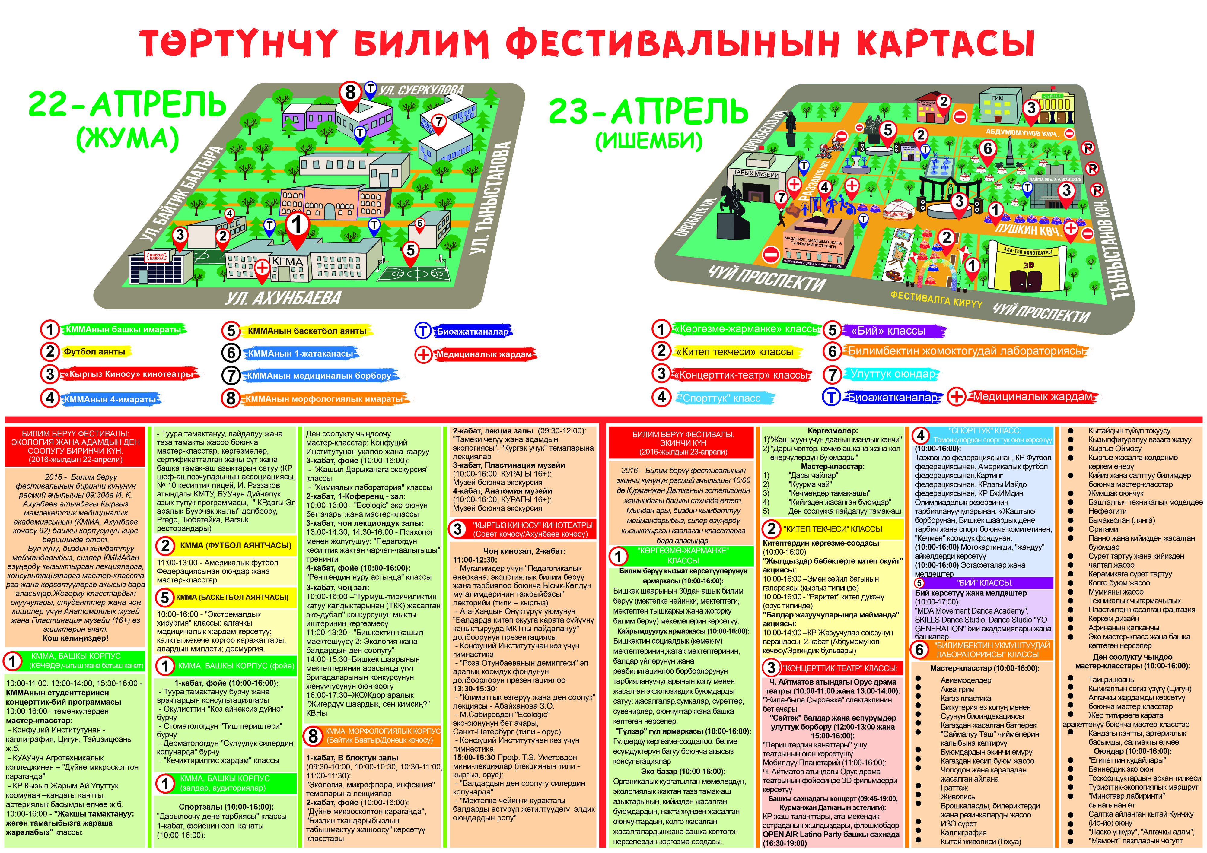 Билим берүү мекемелери, балдардын чыгармачылык борборлору, өнүктүрүүчү оюндар, китеп базарлары, чыгармачылык өнөрканалар, бий, спорттук жана оюн аянттар, көргөзмөлөр жана жарманкелер, ошондой эле башка көптөгөн жакшы нерселер Сиздерди 22 жана 23-апрелде – Билим берүү Фестивалында күтөт. Келгиле да, көңүлүңөргө жаккан ишти тандап алгыла!