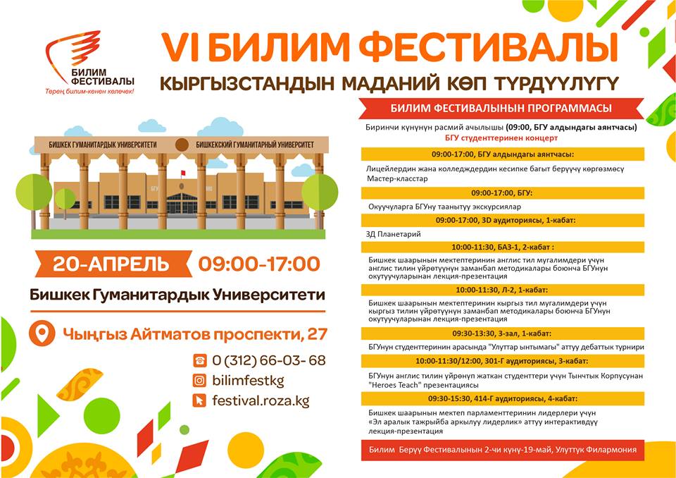 20-апрелде К.Карасаев атындагы Бишкек Гуманитардык Университетинде мектеп окуучуларынын жана студенттердин, мамлекеттик жана эл аралыкуюмдардын, Кыргызстанда аккредитацияланган элчиликтердин өкүлдөрүнүн катышуусу менен «Кыргызстандын маданий көп түрдүүлүгү: досторума мейманга» 2018 - Билим фестивалынын биринчи күнүнүн расмий ачылышы болот.