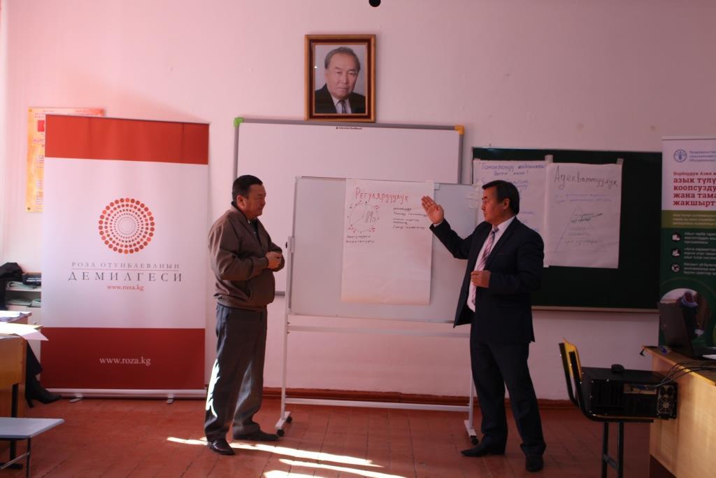 November 7, 2018, 06:00Бириккен Улуттар Уюмунун Азык түлүк жана айыл чарба уюму (БУУ ФАО) жана «Роза Отунбаеванын демилгеси» ЭКФ тарабынан Россия Федерациясынын финансылык колдоосу менен өткөрүлүп жаткан «Жергиликтүү бийлик институттарынын жана жарандык коомдун өкүлдөрүнүн потенциалын арттыруу аркылуу туура тамактануунун жана туура тамактануу көндүмдөрүн калыптандыруунун негиздери боюнча калктын маалымдар болушун арттыруу» деген биргелешкен долбоордун алкагында үстүбүздөгү жылдын 5-ноябрында Кемин шаарында (Чүй областы) туура тамактануу боюнча семинар-тренинг өттү.