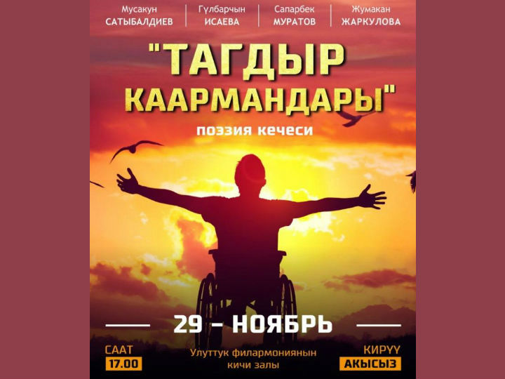 «Роза Отунбаеванын демилгеси» эл аралык коомдук фонду Т.Сатылганов атындагы Кыргыз Улуттук филармония менен биргеликте элибизге таанымал акындардын жана таланттуу жаш акындардын поэзия кечелерин 2016-жылдын март айынан тарта ай сайын үзбөй өткөрүп келатат. Кезектеги «Тагдыр каармандары» поэзия кечеси акын жана жазуучу Мусакун Сатыбалдиевдин, акындар Жумакан Жаркулованын, Сапарбек Муратовдун , Темирлан Ормуковдун жана Гүлбарчын Исаеванын чыгармачылыгына арналат. Кече 2018-жылдын 29-ноябрында Т.Сатылганов атындагы Кыргыз Улуттук филармониясынын Кичи залында өтөт. Башталышы саат 17.00