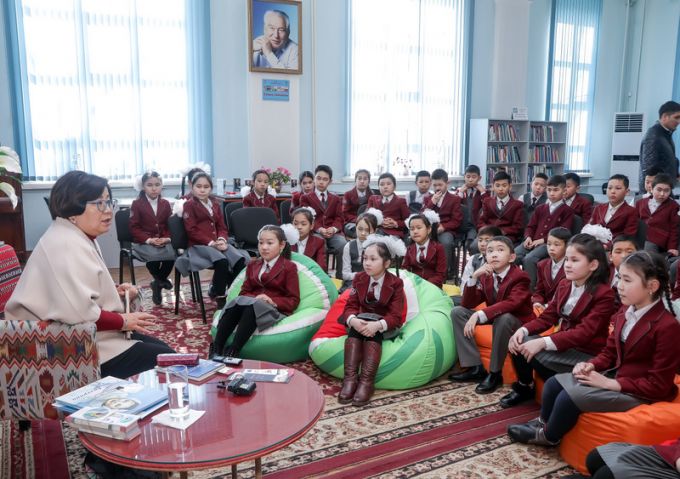 March 4, 2019, 06:002019-жылдын 1-март күнү Бишкек шаарындагы К.Баялинов атындагы китепканада Кыргыз Республикасынын экс-Президенти Р.И.Отунбаева балдарга китеп окуп берди.