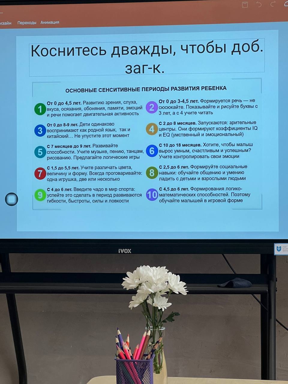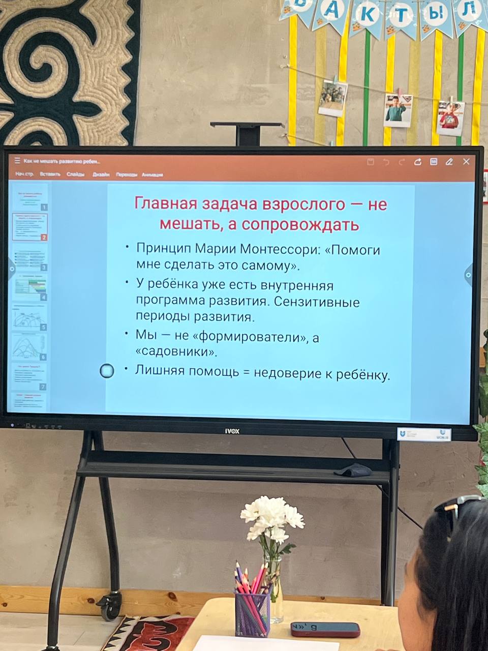 Лекциянын негизги максаты — ата-энелерге бала өнүгүүсүнүн эрте курактагы өзгөчөлүктөрү жөнүндө түшүндүрүү берип, алардын ролунун маанилүүлүгүн белгилөө болду. Иш-чаранын лектору, тажрыйбалуу адис жана педагог Элмира Каримова, ата-энелер менен жандуу баарлашуу форматында өз тажрыйбасы менен бөлүшүп, 0–5 жаштагы балдардын ой жүгүртүүсү, эмоционалдык абалы жана ата-энелик колдоонун ролу тууралуу кызыктуу жана практикалык маалыматтарды берди.