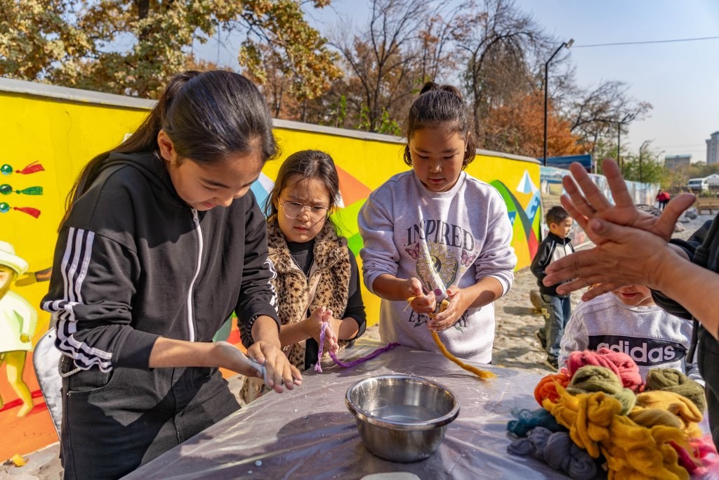 кийиз студиясынын уздары катышуучуларга жамаат аянтчасында жүндөн шуру жана гүл