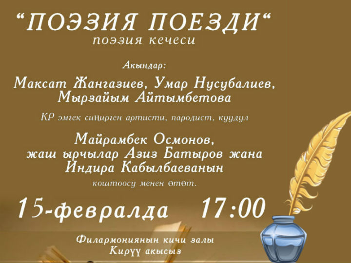 «Роза Отунбаеванын демилгеси» эл аралык коомдук фонду Улуттук Филармония менен биргеликте Кыргызстандагы эл-журтка кеңири белгилүү акын, жазуучулардын жана жаш таланттардын поэтикалык кечелеринин сериясын тартуулоону улантууда. Мындай кеченин кезектегиси эл ичинде сүймөнчүлүккө ээ болгон жаш акын, Ч.Айтматов атындагы мамлекеттик жаштар сыйлыгынын ээси Максат Жангазиевдин, акындар Мырзайым Айтимбетованын жана Умар Нусубалиевдин чыгармачылыгына арналат.