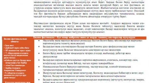 Бишкекте экинчи Билим берүү фестивалы өтөт, анын багыты - техникалык кесиптерге кызыгууну кайра жаратуу, ошондой эле балдардын илимий-техникалык чыгармачылыгын өнүктүрүү жана демейки экологиялык билимдерди жайылтуу