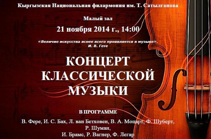 21 ноября (пятница) 2014 года Международный общественный фонд «Инициатива Розы Отунбаевой» совместно с Посольством Федеративной Республики Германия в Кыргызской Республике, с Кыргызской Национальной консерваторией и Гёте-Институт (Алматы) проводит КОНЦЕРТ КЛАССИЧЕСКОЙ МУЗЫКИ в рамках международного проекта «Немцы в истории Кыргызстана».