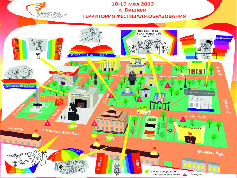 Территория Фестиваля образования – это площадь «Ала-Тоо», Дубовый парк, Государственный исторический музей КР, Кыргызский национальный академический драматический театр им.Т. Абдумомунова, Национальный центр для детей и юношества «Сейтек», Кинотеатр «Ала-Тоо», территория у памятника Курманжан Датке, Государственный национальный русский театр драмы им.Ч. Айтматова! Ожидаемое количество гостей и участников мероприятия – 50 тыс. человек!