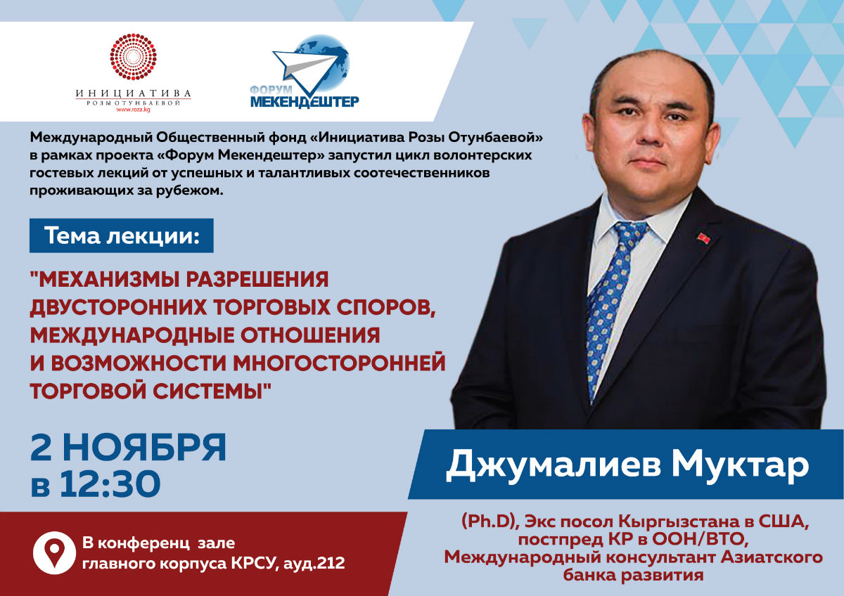 2 ноября в рамках программы «Гостевые лекции Мекендештер» Международного общественного фонда «Инициатива Розы Отунбаевой» состоится встреча с Экс-послом Кыргызстана в США, постпредом КР в ООН/ВТО, Международным консультантом Азиатского банка развития, (Ph.D) Муктаром Джумалиевым.