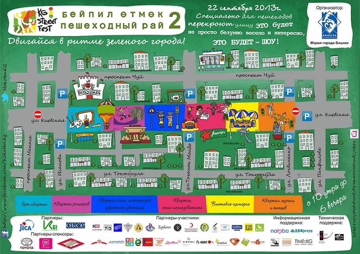 Уличный фестиваль KG Street Fest «Пешеходный рай» - это грандиозное мероприятие городского масштаба для самых активных любителей зеленых улиц и правил безопасного движения, которое проводится совместно Мэрией г. Бишкек, Агентством развития города и УДПС ГУВД г. Бишкек.