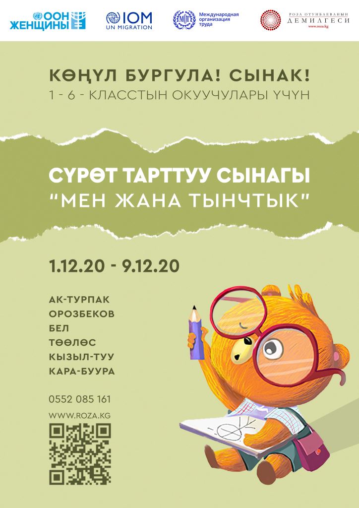 “Коомчулукту инклюзивдүү жана тынчтык жолу менен өнүктүрүүдө миграцияга дуушар болгон аялдардын жана кыздардын укуктарын жана мүмкүнчүлүктөрүн кеңейтүү” долбоорунун алкагында Ош, Баткен, Жалал-Абад, Талас облустарындагы 6 пилоттук айыл өкмөттөрдүн, пилоттук айылдардагы орто мектептердин 1-6-класстардын окуучуларынын арасында “Мен жана тынчтык” темасында сүрөт тартуу сынагы өткөрүлөт.