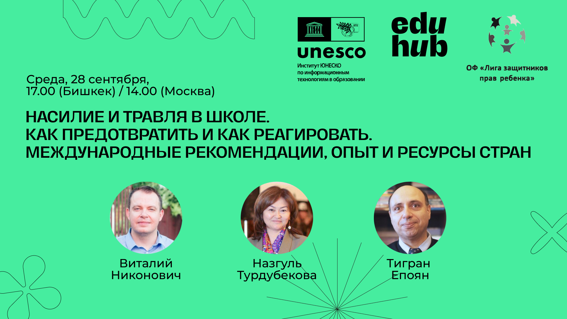 EDUHUB, ИИТО ЮНЕСКО, Бюро ЮНЕСКО в Алматы и Лига защитников прав ребенка приглашают на вебинар о противодействии насилию и травле в школе.