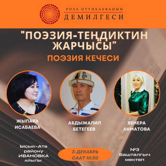 2023-жылдын 3-декабрында саат 11:00 Чүй облусунун Ивановка айыл өкмөтүндөгү №3 башталгыч мектебинде “Роза Отунбаеванын демилгеси” Эл аралык коомдук фонду уюштурган “Поэзия-теңдиктин жарчысы” аттуу поэзия кечеси өтөт.