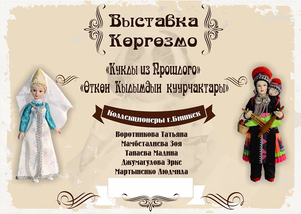 Выставка дает возможность познакомиться с куклами из разных стран и разных эпох. Представлены около 80 кукол из частных коллекций коллекционеров Бишкека Ворониковой Татьяны, Мамбеталиевой Зои, Тапаевой Мадины, Джумагуловой Эрке,Мартыненкой Людмилы.
