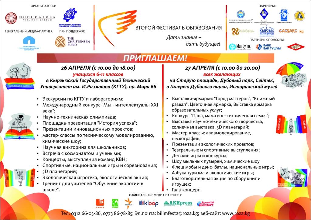 26-27 апреля 2014 года, в течение двух выходных дней в столице Кыргызстана, городе Бишкек, уже во второй раз состоится мероприятие городского масштаба – «Фестиваль образования»!