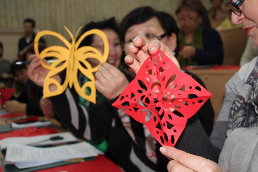 В мастер-классе приняли участие больше 150 человек из Бишкека и Чуйской области: учителя школ, воспитатели детских садов и педагоги Центров детского творчества из всех районов Бишкека. Под руководством мастера из Института Конфуция участники начали с вырезания самых простых фигур. За два часа занятий было показано и выполнено четыре образца узоров различной сложности.
