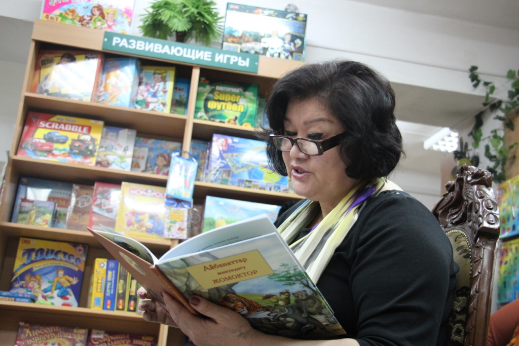 Жылдызкан Жолдошева, которая пришла со своей внучкой. Жылдызкан Айтибаевна прочитала ребятам любимые произведения детства и не одну, а несколько сказок на кыргызском языке, дети были очень увлечены: рассказывали стихи, пели. Самым активным Жылдызкан Жолдошева подарила свой автограф с приятными пожеланиями на книжке "Звезды, читающие детям". В завершение встречи дети рисовали героев прочитанных сказок, рисунки получились очень интересные.