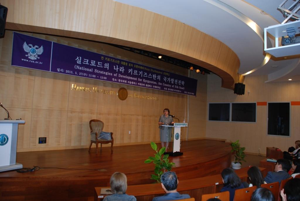 May 28, 2015, 06:00Экс-Президент Кыргызской Республики Отунбаева Р.И. 27 мая 2015 года выступила с лекцией о проблемах и вызовах экономического и демократического развития в Кыргызстане в ведущем университете Кореи Ханкук в Сеуле.