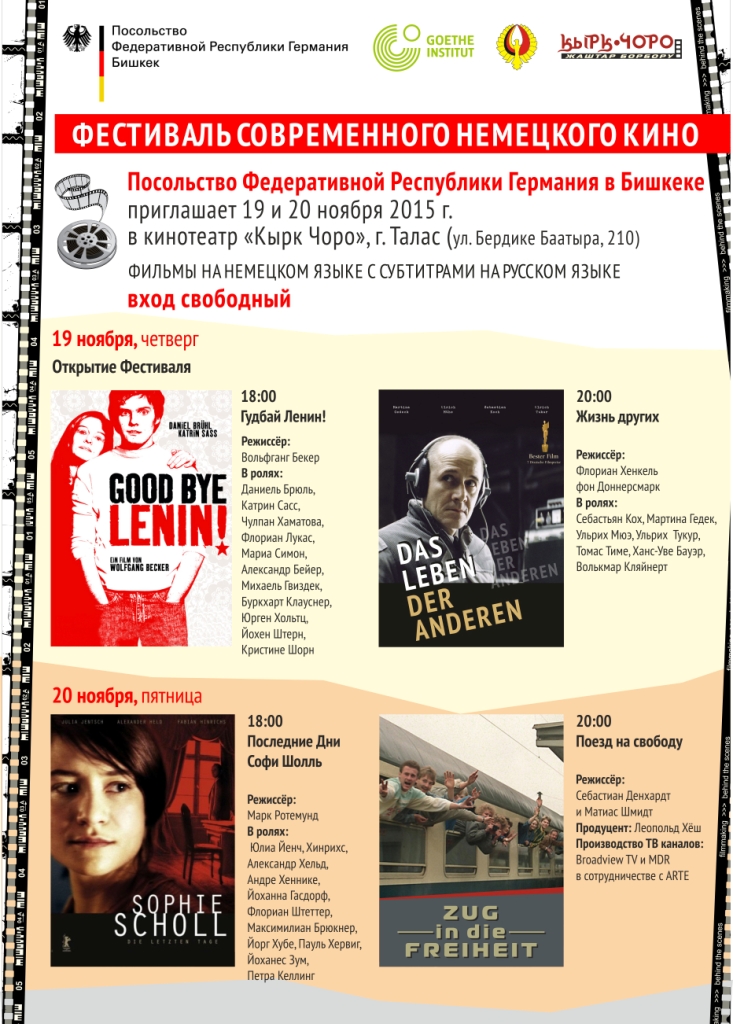 Посольство Германии совместно с Народным советом немцев в Кыргызстане 19 и 20 ноября проведут Дни немецкого кино, которые пройдут в Таласе в кинотеатре «Кырк Чоро». Зрители смогут увидеть такие известные картины как «Гудбай Ленин!», «Поезд на свободу», «Последние Дни Софи Шолль», «Жизнь других». Демонстрация фильмов пройдет на немецком языке с субтитрами на русском языке. Организаторы приглашают всех жителей города Талас на просмотр современного немецкого кино.