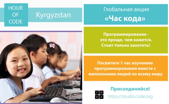 С 7 по 13 декабря 2015 года в Кыргызстане пройдет беспрецедентная акция #ЧасКода, которая объединит весь мир! В течение недели уникальные открытые уроки Часа Кода, которые изменят представление об ИТ и программировании, пройдут сразу в нескольких школах, ВУЗах и других различных площадках нашей страны. «Час Кода» – это самое крупное образовательное мероприятие в истории, достигающее десятков миллионов студентов и пользователей гаджетов в 180 странах мира.