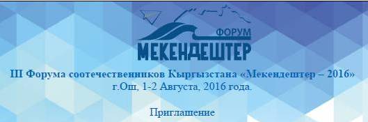 Приглашаем Вас принять участие в III Форуме соотечественников Кыргызстана «Мекендештер – 2016», который пройдет 1-2 августа 2016 года, в Ошском Государственном Университете, в городе Ош (Кыргызская Республика).