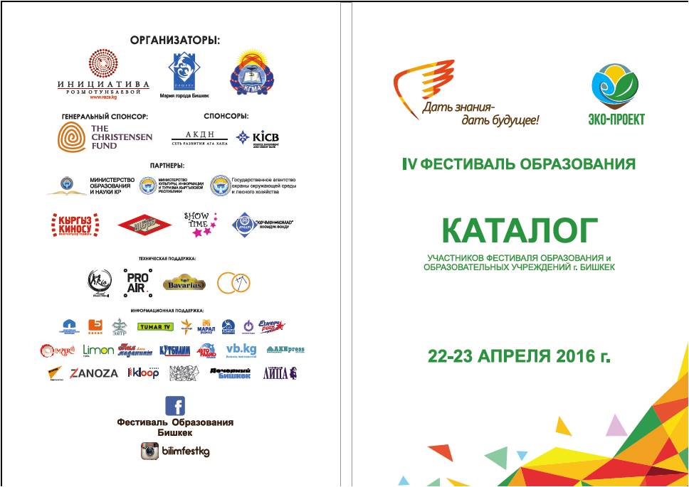 Ежегодно, начиная с 2013 года, мы проводим в городе Бишкек Фестиваль образования. Каждый Фестиваль мы стараемся провести лучше предыдущего, помочь детям и их родителям найти подходящие для них образовательные учреждения (внешкольное, школу, вуз) , зародить в молодом поколении интерес к саморазвитию, внести значимый вклад в образование и развитие подрастающего поколения, в частности в повышение эко-культуры и пропаганду бережного отношения к окружающей нас среде.
