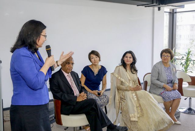 Экс-президент Кыргызстана, учредитель Международного общественного фонда Роза Отунбаева рассказала гостям встречи о двухсторонних отношениях между Кыргызстаном и Индии, а также, что Индия является многокультурной развивающей страной, откуда можно многому научится.