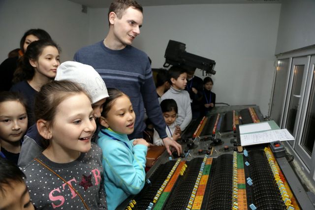 January 7, 2017, 06:00В рамках программы "Квартал искусств" прошла экскурсия за кулисы Театра русской драмы им. Ч. Айтматова, которую провел главный режиссер-постановщик театра Нурлан Асанбеков. Дети, пришедшие в этот день на экскурсию и их родители, смогли увидеть театр «изнутри». Они увидели пульт звукорежиссера, побывали в помещениях под главной сценой театра, увидели все те механизмы и рычаги, которые позволяют сменить декорации на сцене, подземный лифт, на котором актер может появиться на сцене, все тайные закоулки и переходы под сценой. Зашли в гримерную, где наносят грим актерам перед спектаклем, и узнали, что косы и парики готовят из волос яков, а для того, чтобы речь была выразительной, нужно обязательно окончить курс сценической речи.