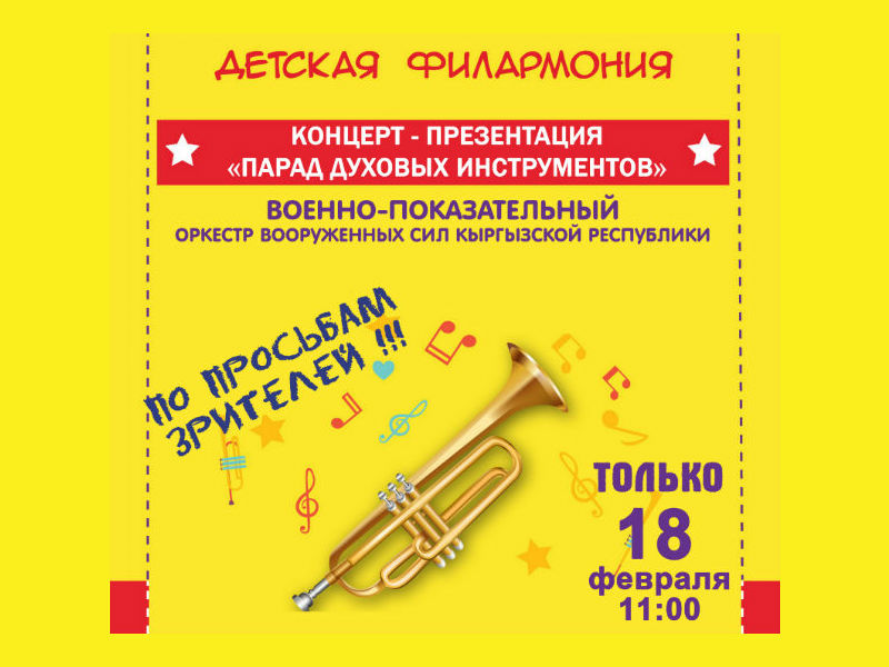 Международный общественный фонд «Инициатива Розы Отунбаевой» совместно с национальной филармонией 18 февраля 2017 г. (суббота) приглашает юных бишкекчан и их родителей на концерт «Парад духовых инструментов» - о медных духовых инструментах в рамках программы «Детская филармония».