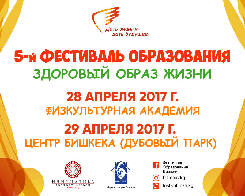 28 и 29 апреля в столице пройдет V Фестиваль образования на тему "Здоровый образ жизни". Фестиваль проводится Международным общественным фондом "Инициатива Розы Отунбаевой" совместно с мэрией Бишкека и Кыргызской государственной академией физической культуры и спорта (КГАФКиС) при поддержке международных, государственных, частных, общественных и молодежных организаций.