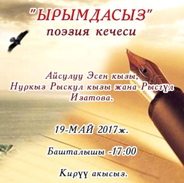 19 мая приглашаем всех любителей поэзии на Вечер поэзии "Ырымдасыз", который начнется в 17-00 в малом зале Кыргызской Национальной филармонии.