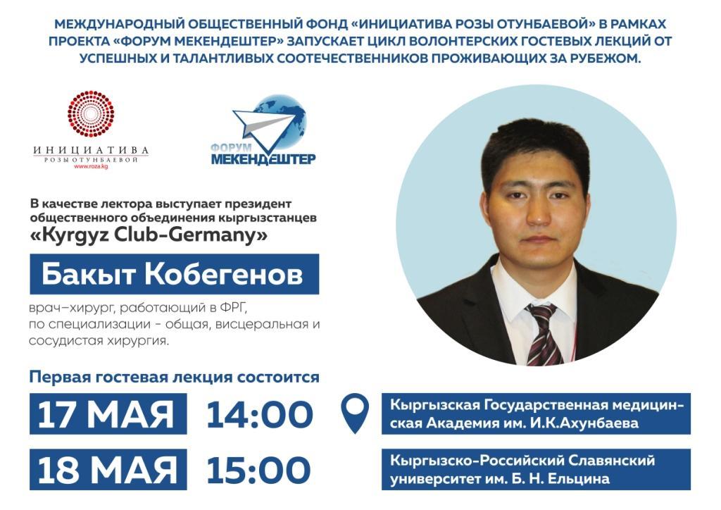 Бакыт Кобегенов, талантливый хирург из Германии закончивший КГМА, возглавляющий отделение объединения «Kyrgyz Club» в Германии выступит с лекцией для студентов и преподавателей столичных ВУЗов с 17 по 18 мая 2017 года.