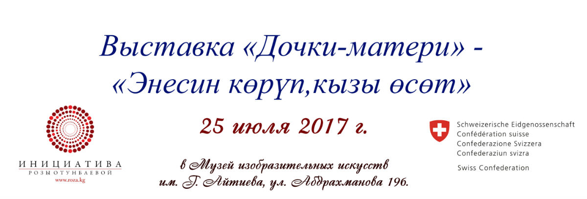 Международный общественный фонд «Инициатива Розы Отунбаевой» представляет выставку «Дочки-матери» или Искусство по наследству. Это концептуальная выставка о преемственности поколений в искусстве. Будет представлен весь спектр работ наиболее известных и талантливых женщин в области визуального искусства – прикладное искусство, ремесла, дизайн одежды, живопись и графика. Эта выставка покажет, как искусство мамы-художницы или мастерицы влияет на выбор дочери, как непрерывно тянется от поколения старшего к молодежи невидимая линия мастерства и любви к искусству. Ведь именно женщины всегда были хранительницами духовного культурного наследия народа.