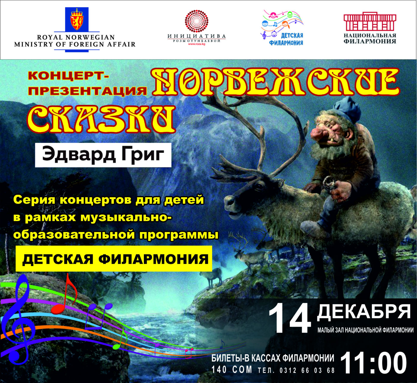 Концерт-презентация познакомит юных слушателей с творчеством норвежского композитора Эдварда Грига. Музыка Грига одна из самых сказочных, она часто используется для сказок, мультфильмов, детских постановок. «Его легко слушать – музыка красивая, легкая для слушания», говорит ведущая программы - музыковед Алтынай Абетекова. Информационная часть расскажет зрителям о культуре, истории и фольклоре Норвегии – далекой северной страны, которая на сегодняшний день стала одной из самых процветающих и успешных стран мира.