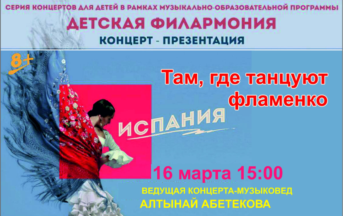 "Детская филармония" приглашает своих старых и новых друзей на новую программу "Испания", которая пройдет 16 марта в 15.00 в малом зале Национальной филармонии.