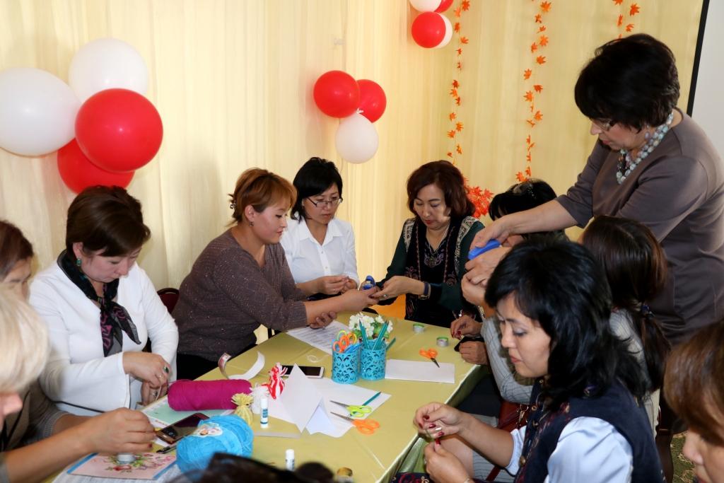 Далее представители Городского центра творчества школьников «Кыргызстан балдары» Авдеенко О.В., Крылова О.В., Савченко Г.Е. и Хижнкова Ю.А. провели участникам 4 мастер-класса с использованием ТБО - «Шапочка из пряжи», «Чудо-ложки», «Волшебное тесто» и «Веселые игрушки».
