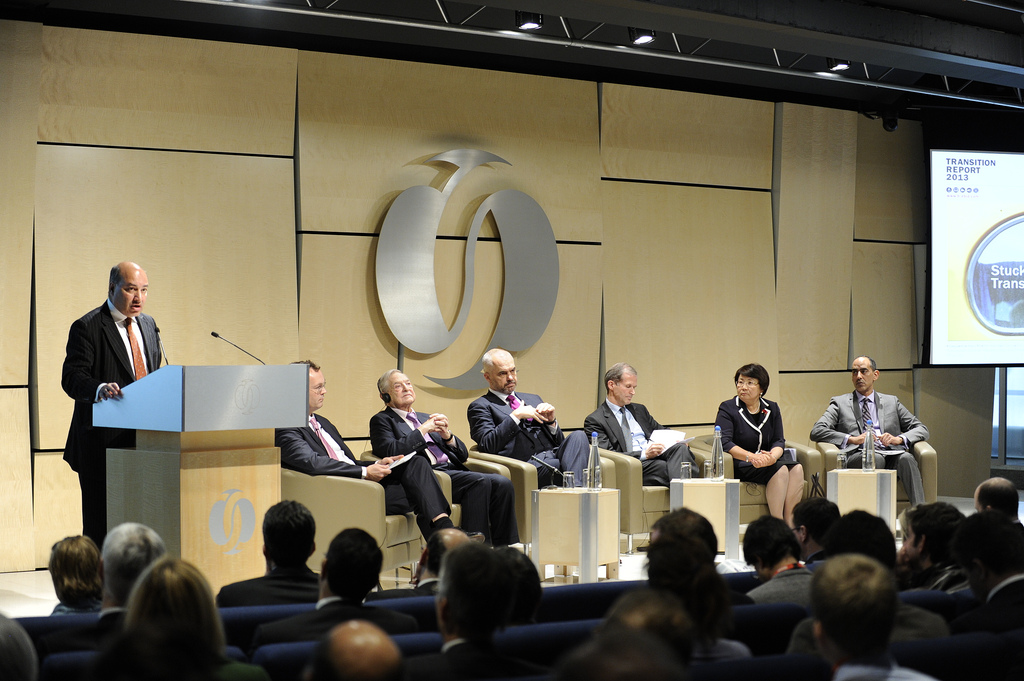 20 ноября 2013 в Лондоне состоялась презентация отчета Европейского банка реконструкции и развития за 2013 год. С комментариями этого доклада выступили Президент ЕБРР сэр Чакрабарти, главный экономист Банка Э.Берглоф, экс-президент Кыргызстана Р.Отунбаева, глобальный инвестор и филантроп Джордж Сорос, премьер-министр Албании Э.Рама, член правления ЦентроБанка Ливии Т.Юсеф. Исследование на тему «Переходный процесс: остановка на пути?» раскрывает почему в странах деятельности Банка после значительных достижений в 1990-е годы свершилось столь мало в плане экономических реформ и большая часть переходных стран на фоне мирового кризиса застряла в замкнутом круге слабых политических и экономических институтов. Инициатива банка об улучшении инвестиционного климата и хорошем управлении предлагает странам обеспечить прозрачность и подотчетность в управлении; и если их проведение затруднено на национальном уровне, то их нужно вести на местном или региональном уровне, говорится в докладе. Международная интеграция может стать мотором транзитного периода, делают вывод авторы и комментаторы доклада. Выйти из сложившегося тупика, считают авторы доклада, можно усиливая человеческий капитал, вкладывая в людей, в их образование, в создание институционального контекста, в рамках которого станет возможным лучшее использование их навыков и знаний.