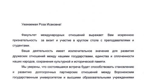 Факультет международных отношений Воронежского государственного университета выражает свою благодарность экс-Президенту КР Р.Отунбаевой