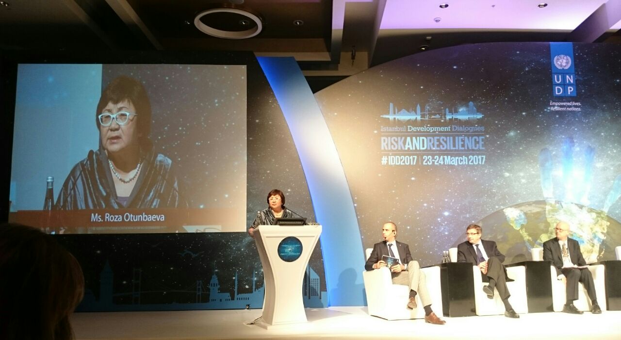 Экс-Президент Кыргызстана Р.И.Отунбаева 23-24 марта 2017 г. приняла участие и выступила с одним из основных докладов "Гендерное равенство, риски чрезвычайных происшествий и устойчивое развитие" на региональной конференции ПРООН "Риски и устойчивость" в Стамбуле.